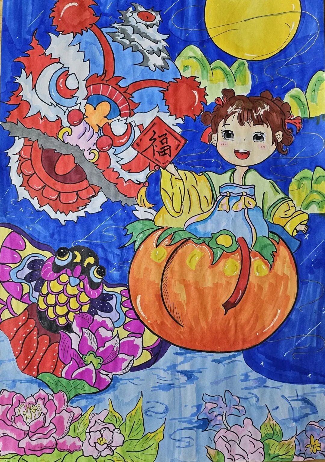 24级保育一班管紫晨、焦雅雯以中秋为主题的绘画作品描绘了祖国中秋的丰收图景,表达了祖国欣欣向荣的繁盛景象。