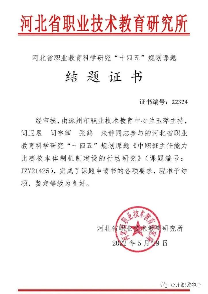 由兰玉萍主任主持,闫卫星、闫宇辉、张鸽和朱静参与的《中职班主任能力比赛校本体制机制建设的行动研究》在2021年度课题中准予结题,等级为良好。董建学副校长主持的《公式法在中职英语语法教学中运用的实践研究》、李海涛主任主持的《职业院校学生创新精神和实践能力的研究》、王丽老师主持《中等职业技术学校汽车运用与维修专业在线开放精品课程建设路径研究》、王文娟老师主持的《中等职业学校班主任能力发展的研究》在2022年度课题中准予正式立项。