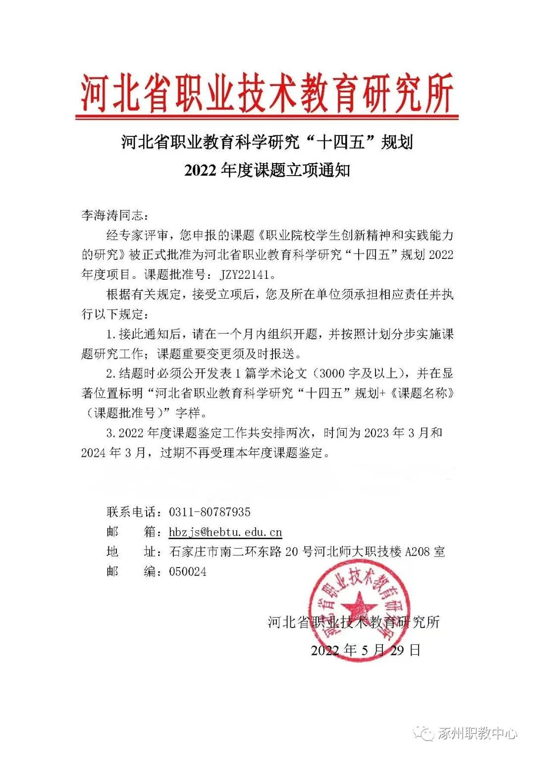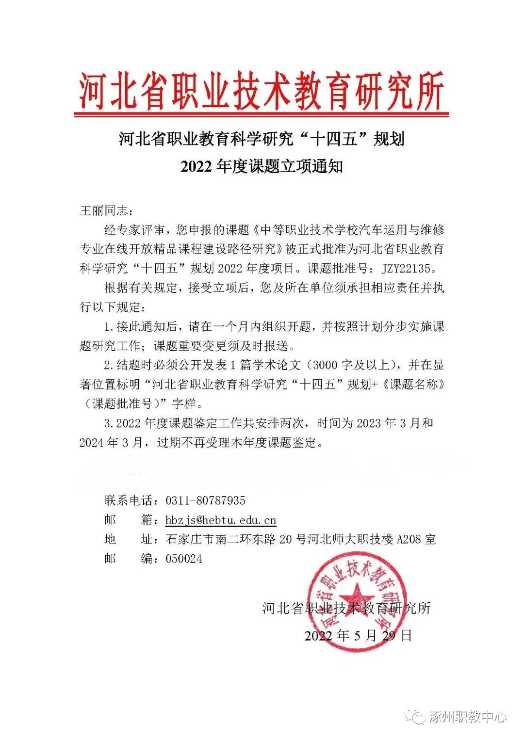 近日,河北省职业技术教育研究所公布了河北省职业教育科学研究“十四五”规划2021年度课题结题名单和2022年度课题立项名单。我校有一项课题顺利结题,四项课题成功立项。