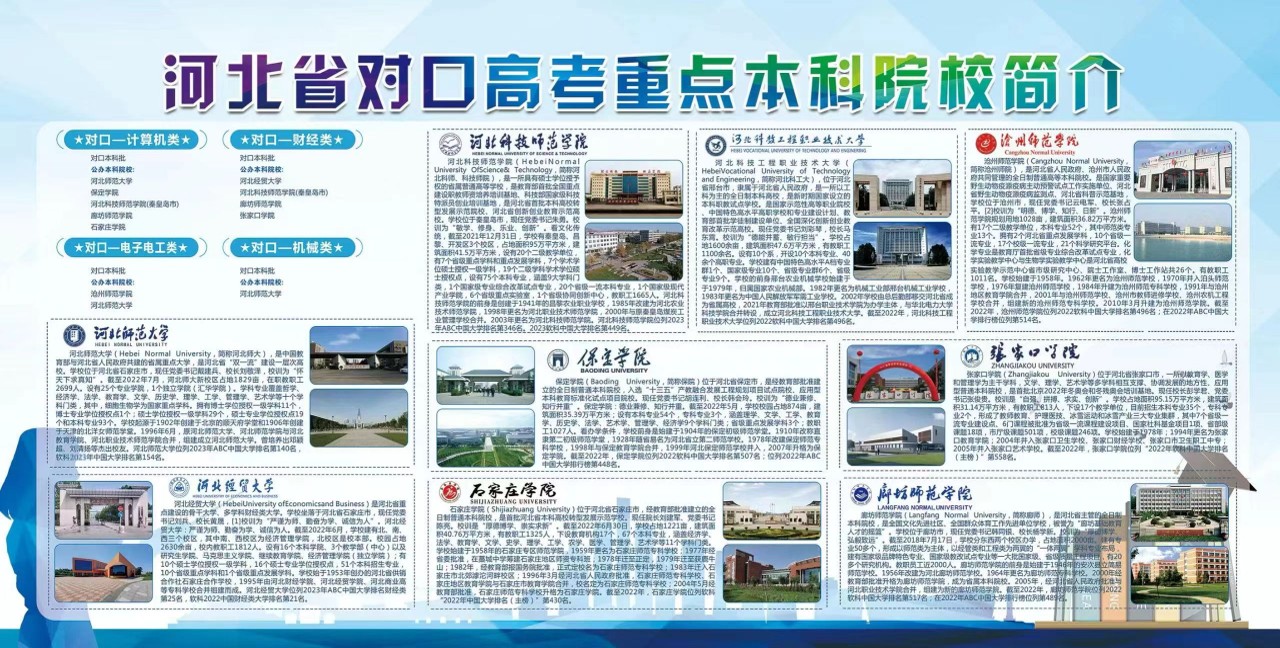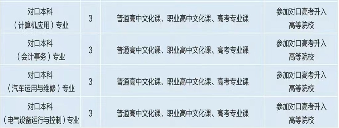 对口高考班分别设有计算机应用专业、会计事务专业、汽车运用与维修专业、电气设备运行于控制专业。在我校学习三年后可参加对口高考升入以下本科院校。